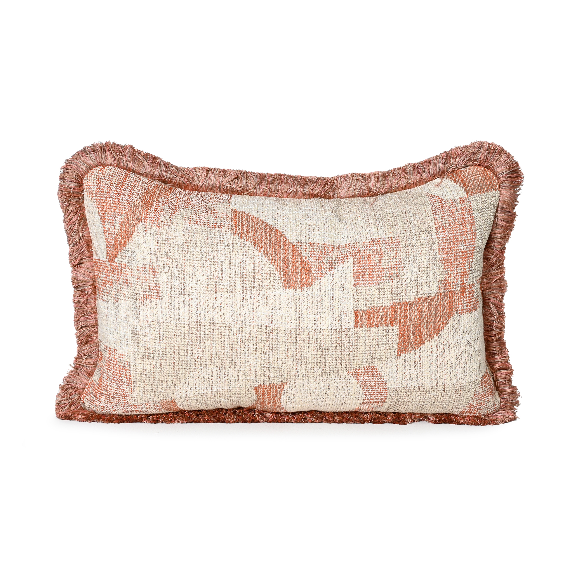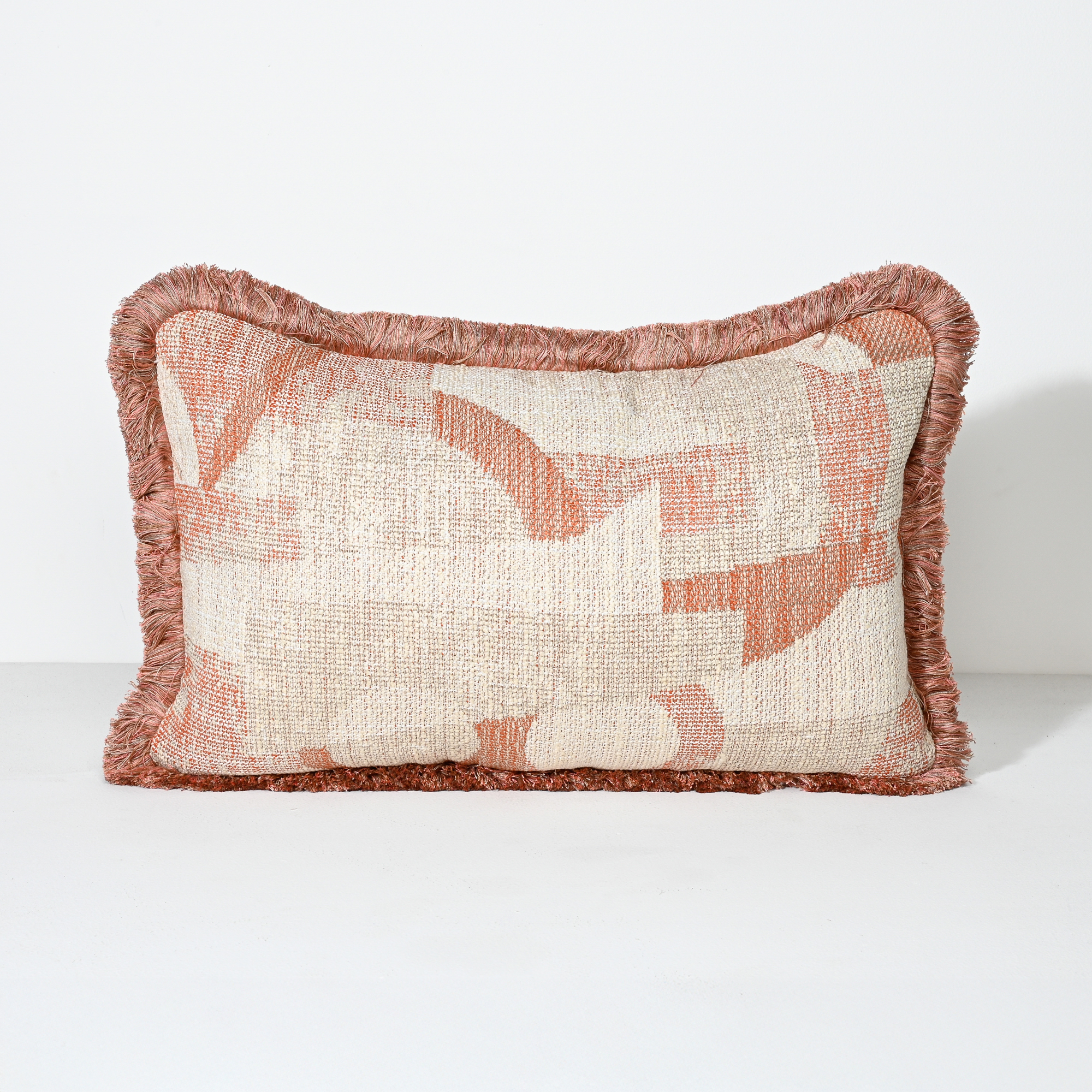 The Belgian Terracotta Cushion is a statement piece designed for the bold and the design-savvy. Upholstered in a richly textured premium woven fabric, this cushion brings warmth, dimension, and unmistakable character to any interior. The abstract terracotta-on-natural pattern exudes modern artistry, while the thick rose coral tassel fringe adds a dramatic, tactile edge that elevates its presence.