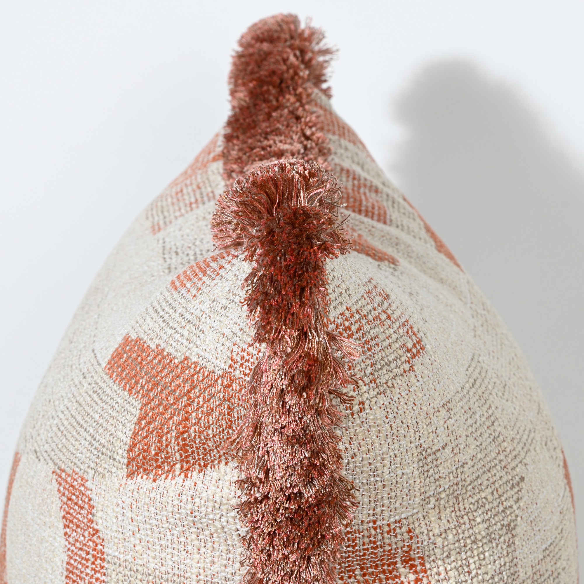 Product description: Beige and terracotta rectangular cushion with coral tassels