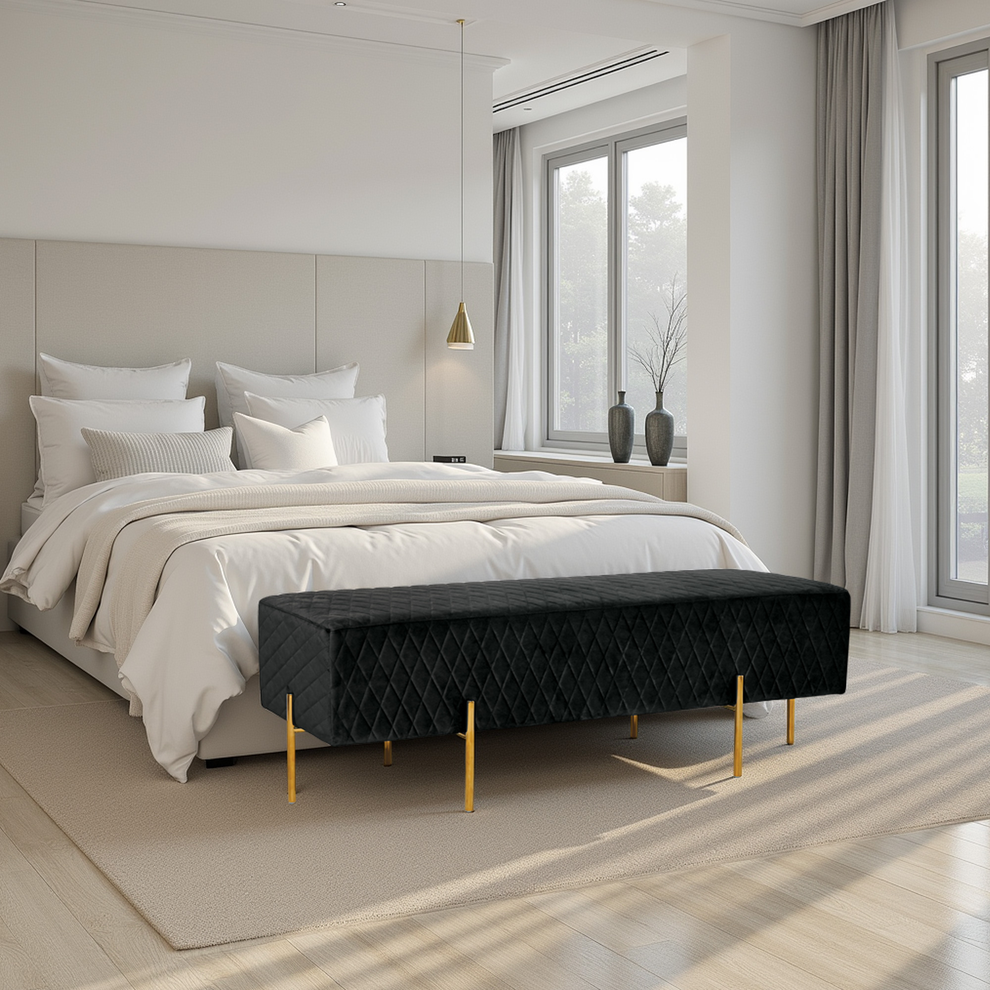 Looking for an interesting black bench ottoman solution for your space? Look no further than our versatile bench ottoman – perfect for adding extra seating, a footrest, or an elegant end-of-bed seat. This versatile piece can also be used in a dressing room for added luxury. Available in a variety of fabrics, our velvet options feature a diamond quilted finish for added elegance. For a more contemporary look, choose one of our unquilted fabric options with black powder-coated legs. Customize your ottoman further by choosing from a variety of leg colors, all of which can be changed upon request. Upgrade your living space with this stylish and functional piece. Order yours today!