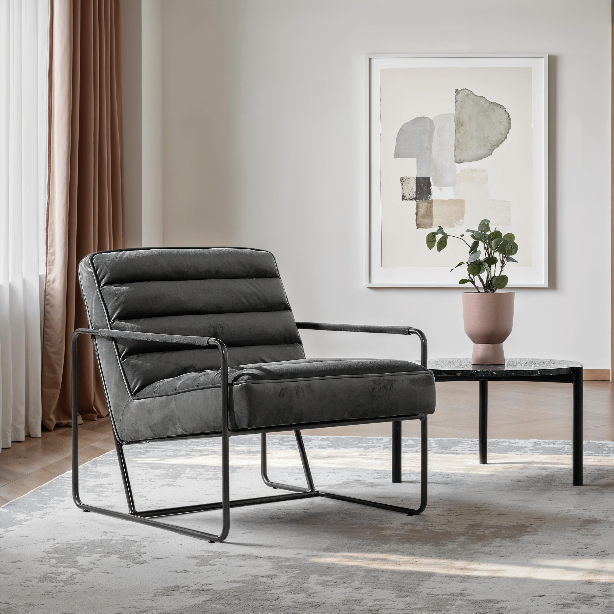 The Cubica chair features clean structured lines with comfortable dimensions. The contemporary design of the powder coated frame is warmed by upholstered arm rests and generous padding. Elevate your space with this charcoal grey armchair.