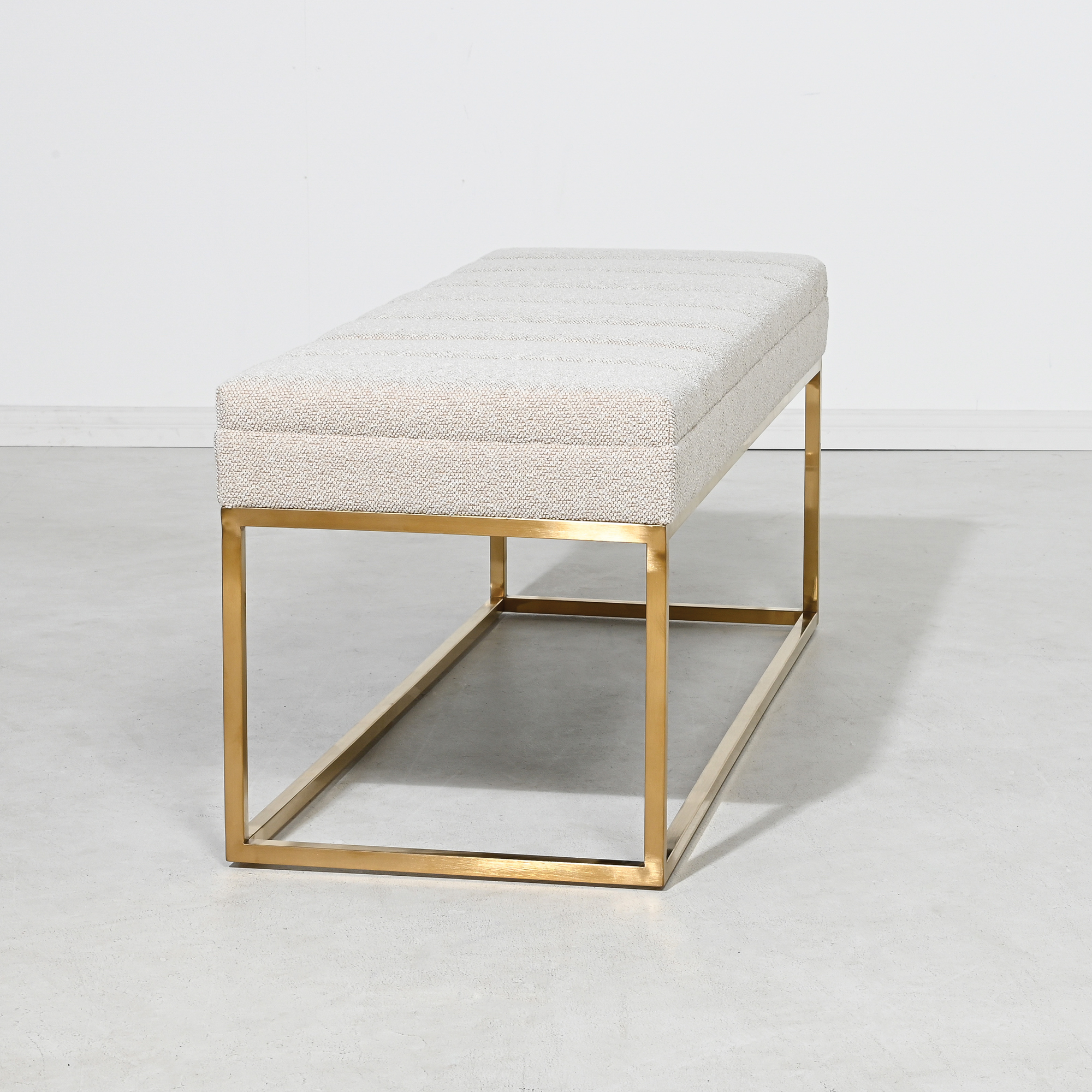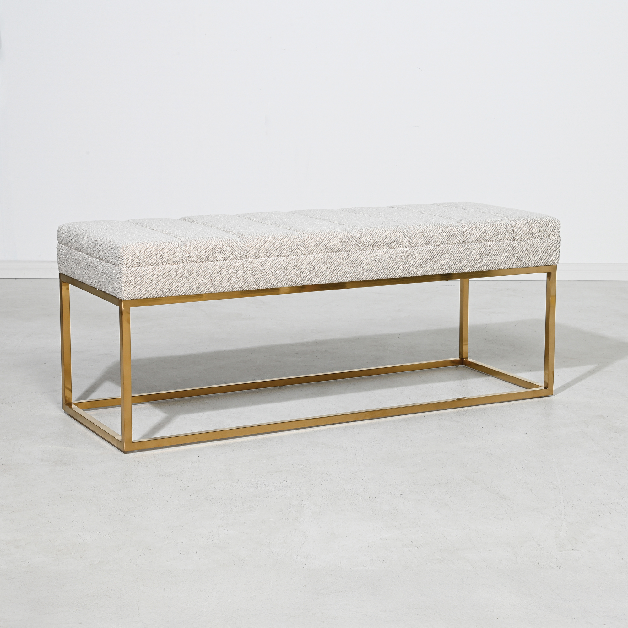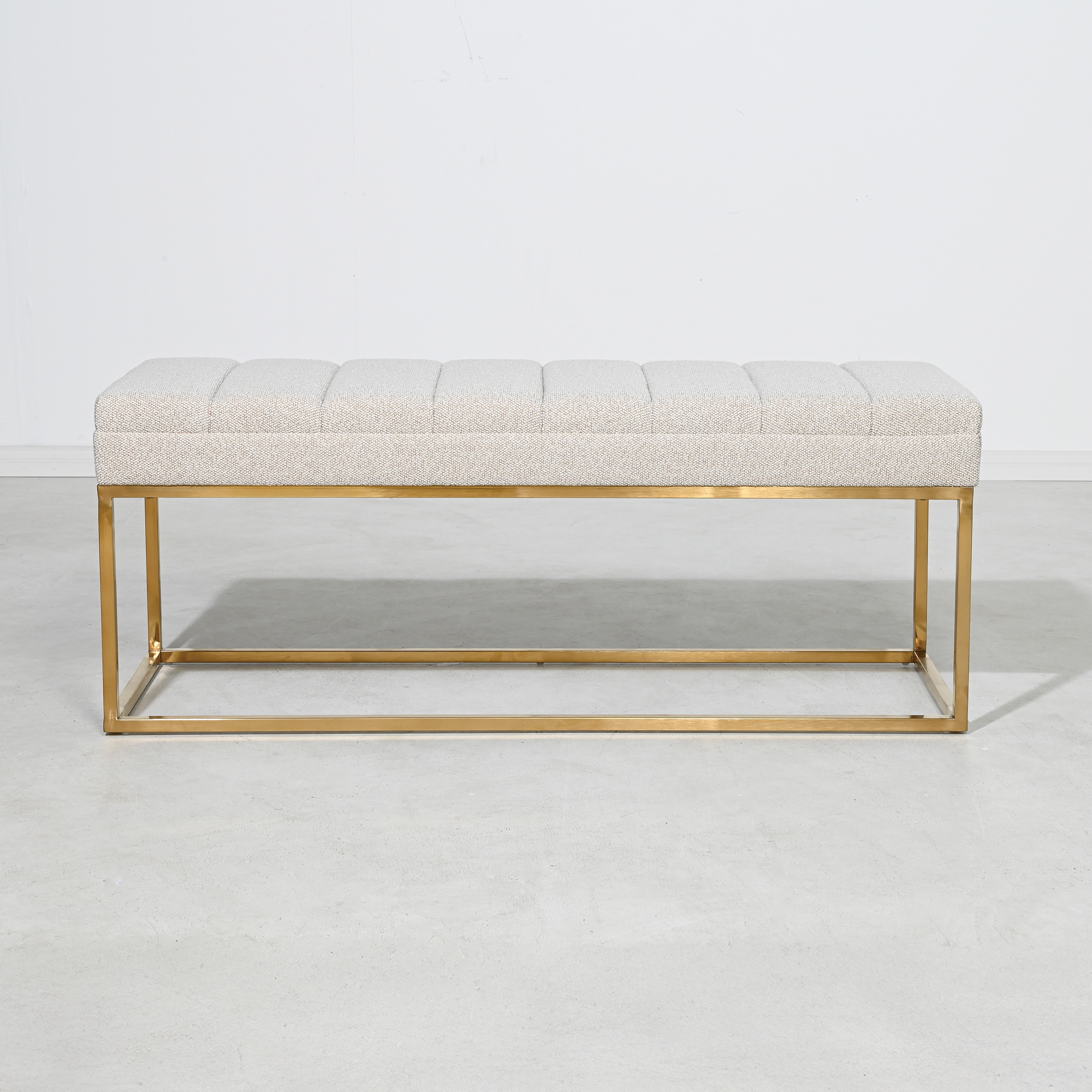 The ottoman is anchored by a brushed stainless steel frame in gold finish, delivering a modern edge with a warm metallic tone. Its open, architectural base keeps the profile light while providing sturdy support—making it ideal for use as a hallway bench, a bedroom accent, or at the foot of a sofa.