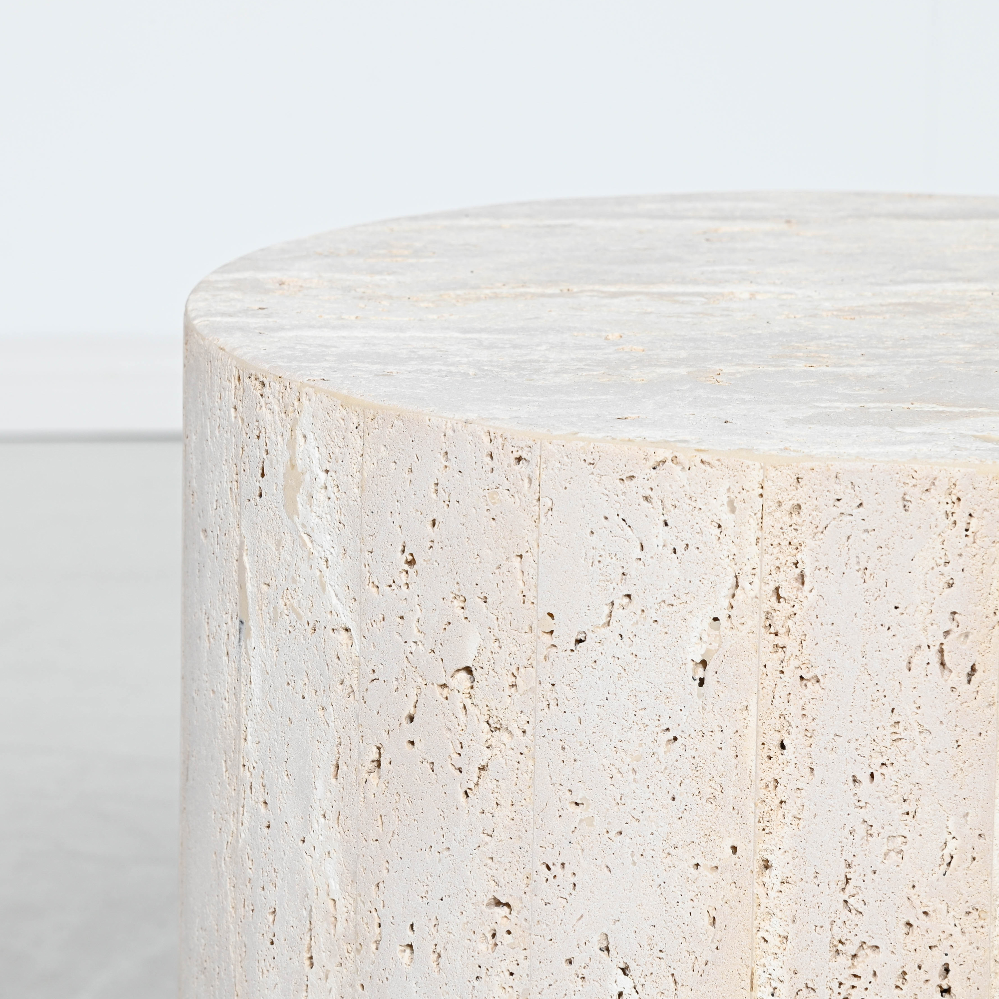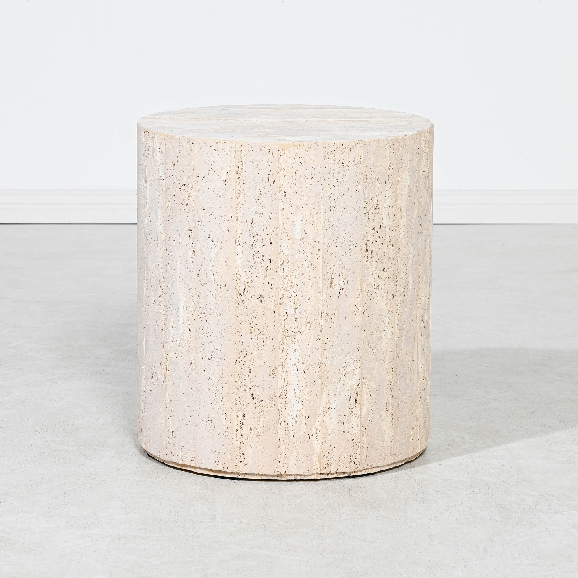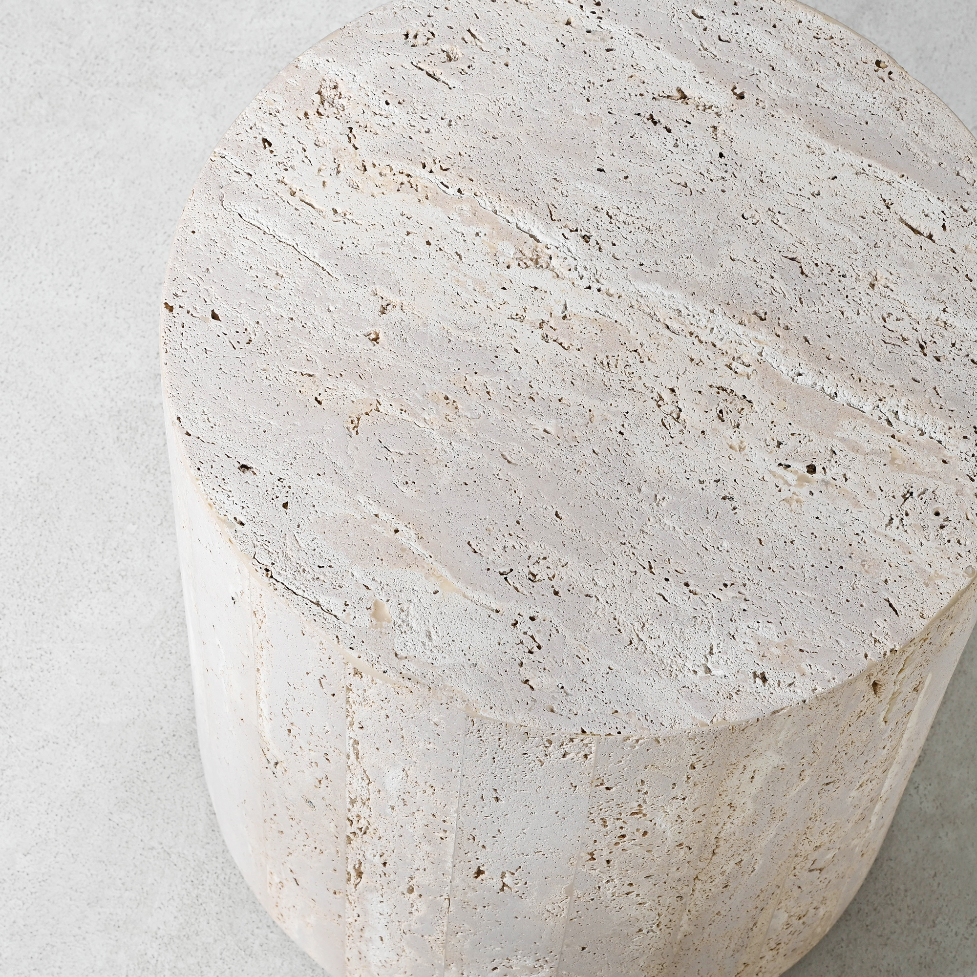 Refined and grounded, the Gerome Side Table is sculpted from solid natural travertine sandstone, celebrating the raw beauty of organic stone. With its minimalist cylindrical form, it stands 45cm high and 40cm in diameter, making it a versatile companion for sofas, armchairs, or bedside settings.