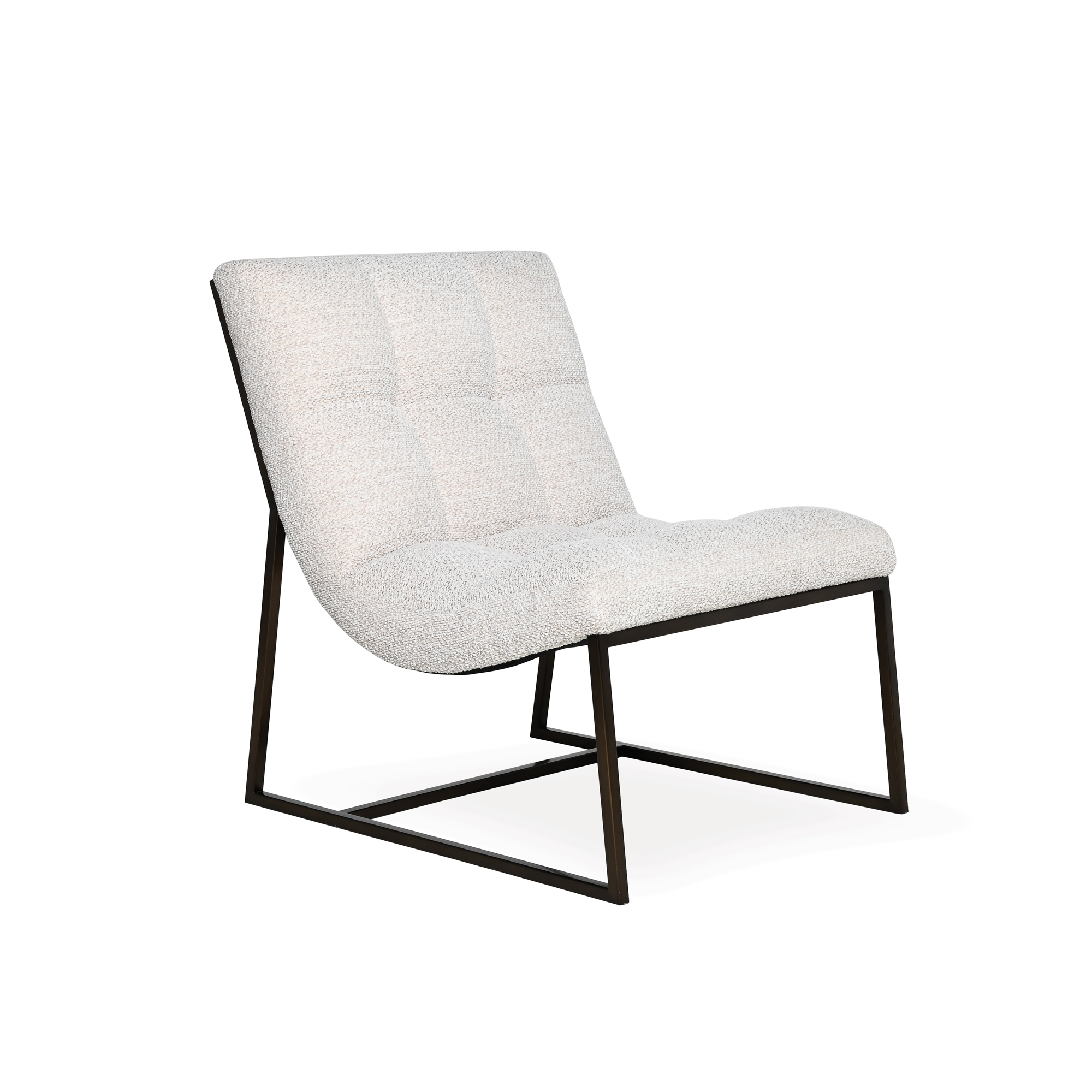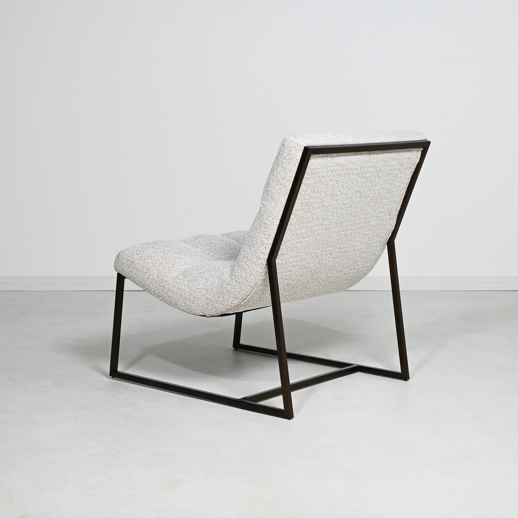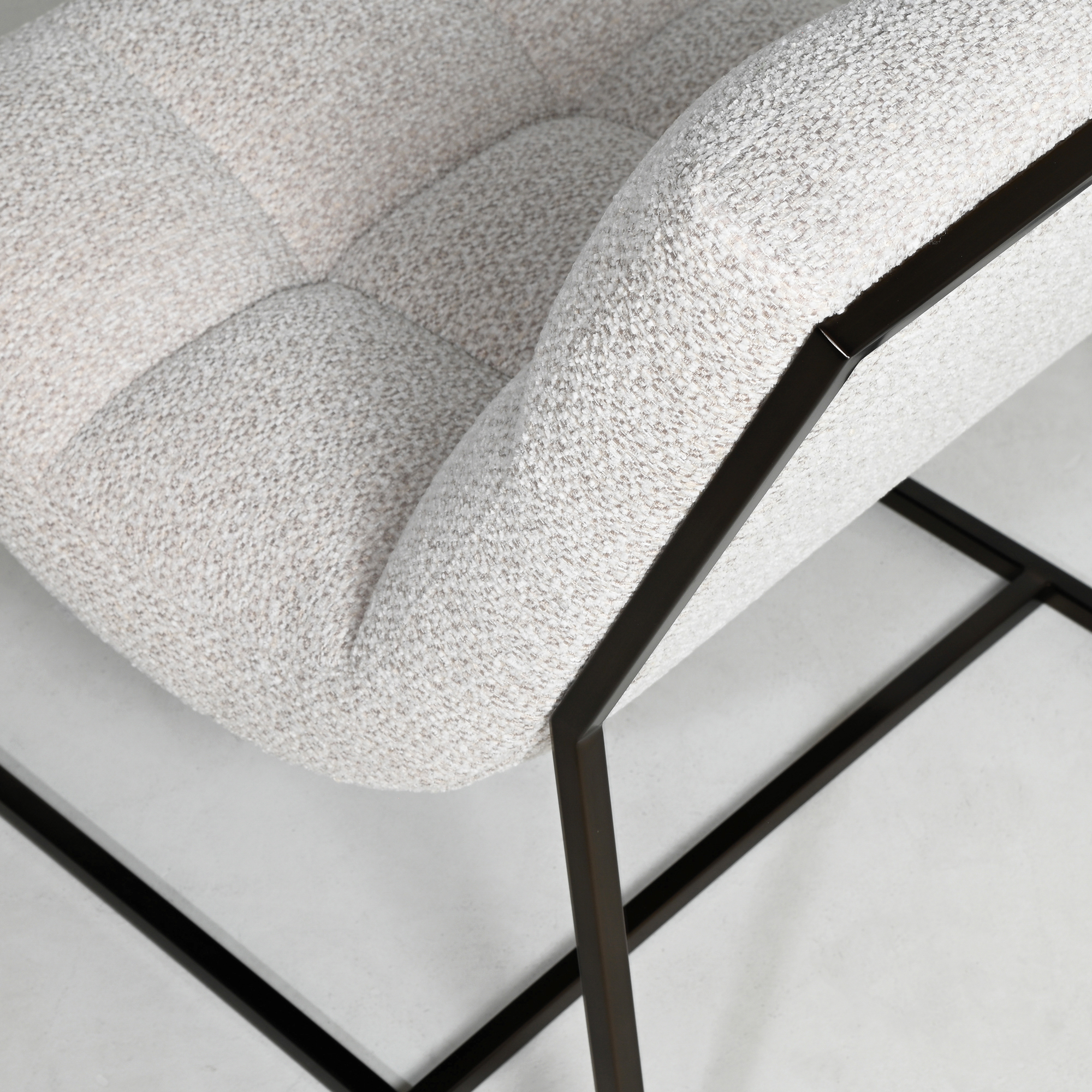 The gently contoured seat features deep, hand-tufted quilting for subtle visual rhythm and elevated comfort. Its sleek black metal frame forms a geometric silhouette—offering an elegant contrast to the plush upholstery and reinforcing its architectural presence.
