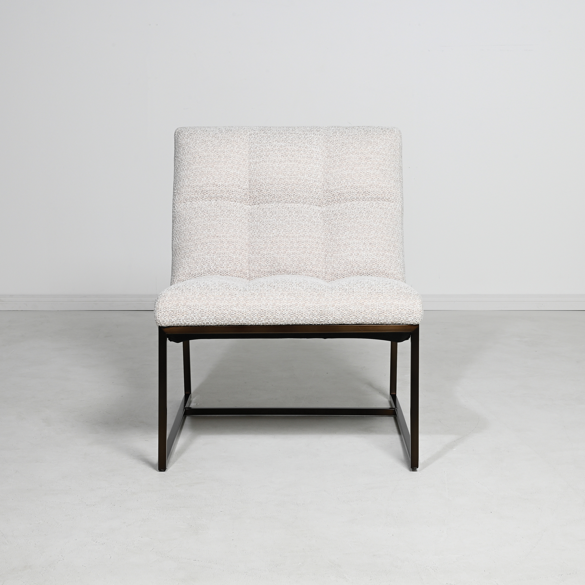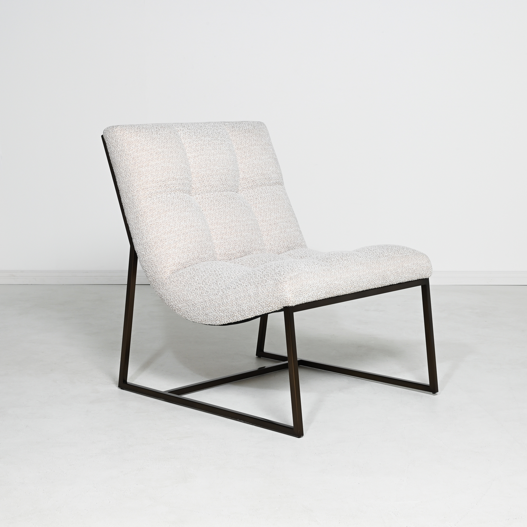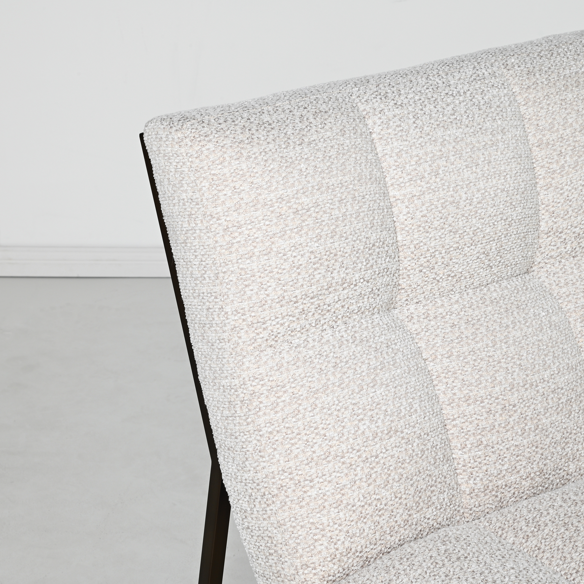 The gently contoured seat features deep, hand-tufted quilting for subtle visual rhythm and elevated comfort. Its sleek black metal frame forms a geometric silhouette—offering an elegant contrast to the plush upholstery and reinforcing its architectural presence.