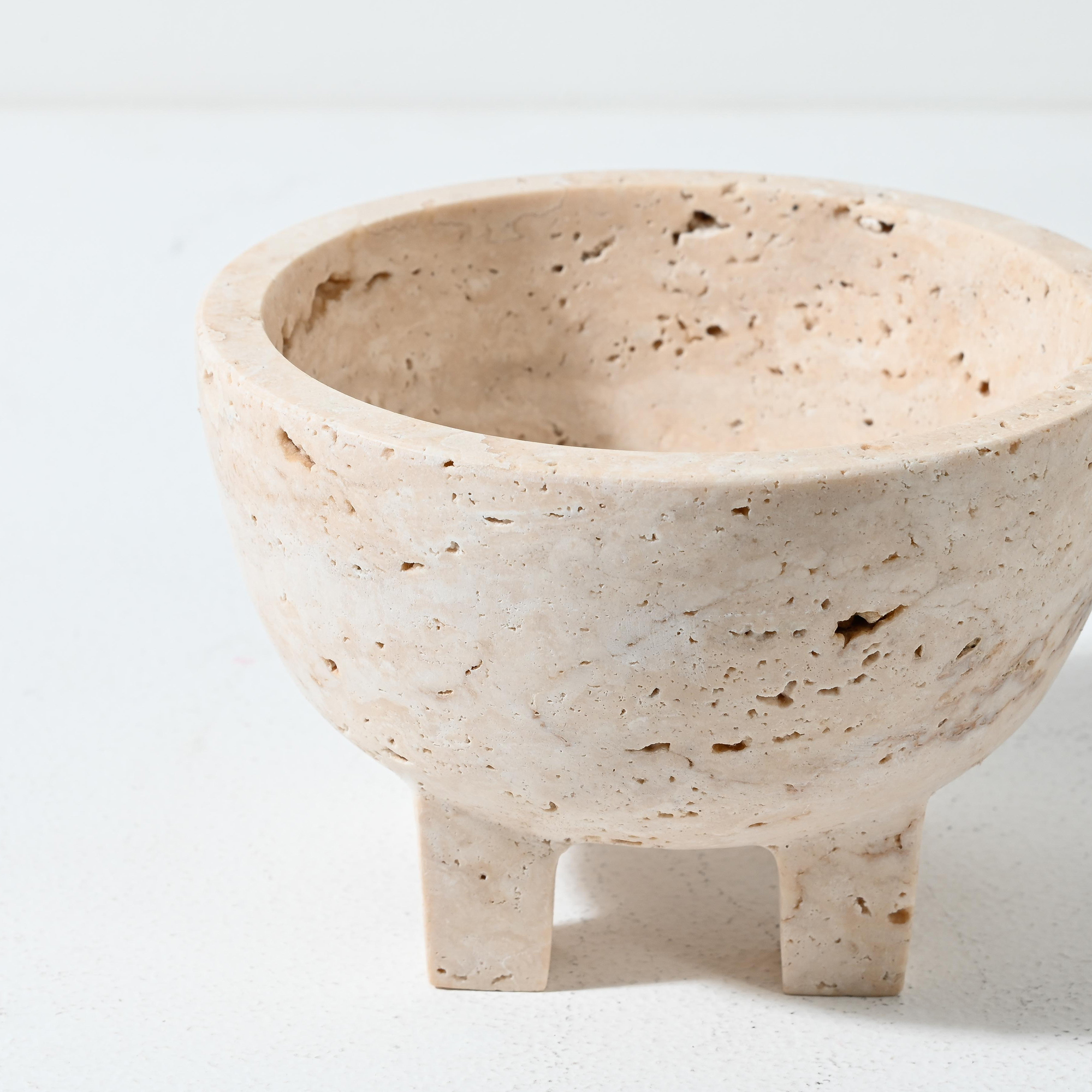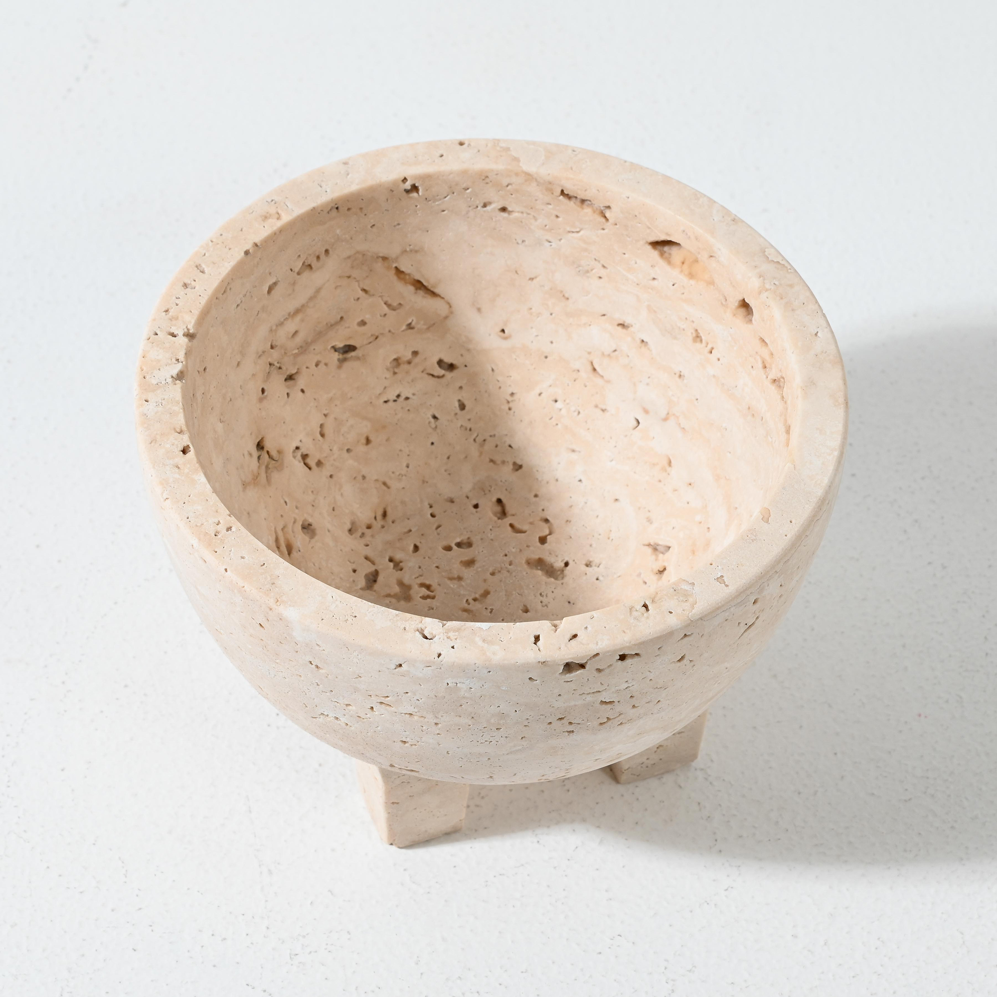 A striking addition to the Namib range, this footed bowl pairs sculptural form with natural texture. Hand-carved from solid travertine, it stands on four block-style legs that elevate the rounded bowl, creating a piece that feels both grounded and architectural.