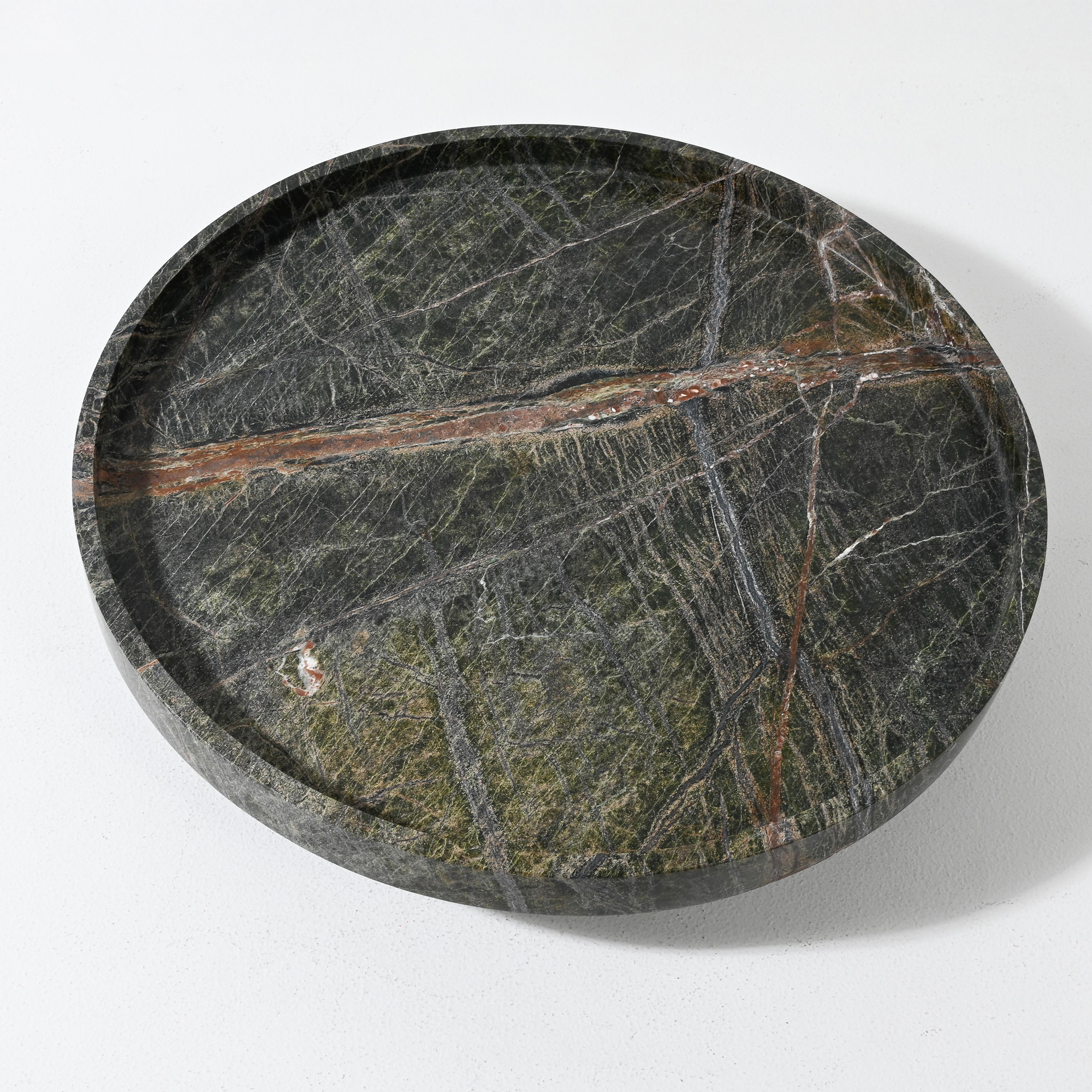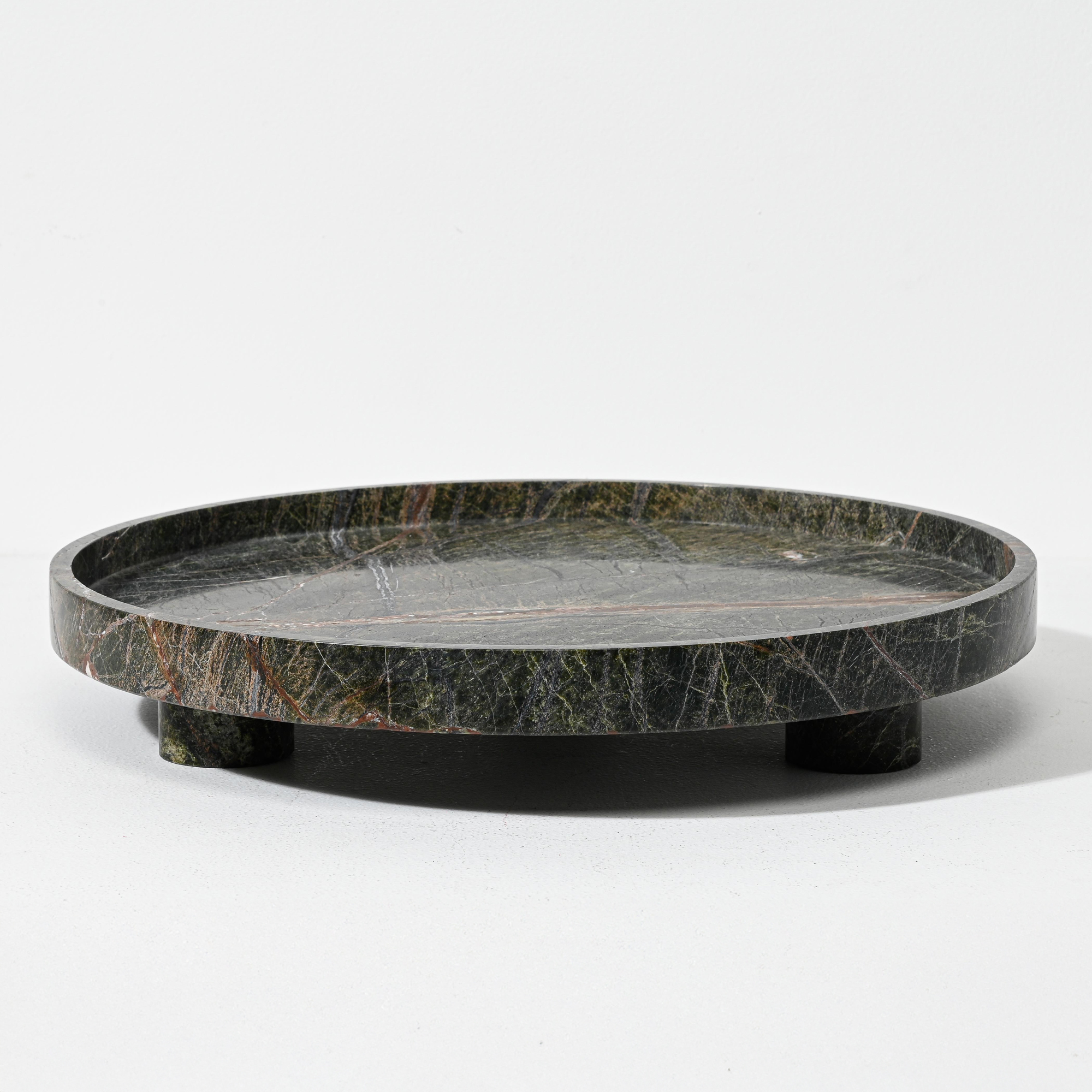The Namib Raised Plate in green marble is a statement in natural elegance and sculptural simplicity. With its wide 45 cm diameter and 7.5 cm height, this elevated plate is designed to anchor a space—resting confidently on three cylindrical legs that lend it a subtle architectural lift.