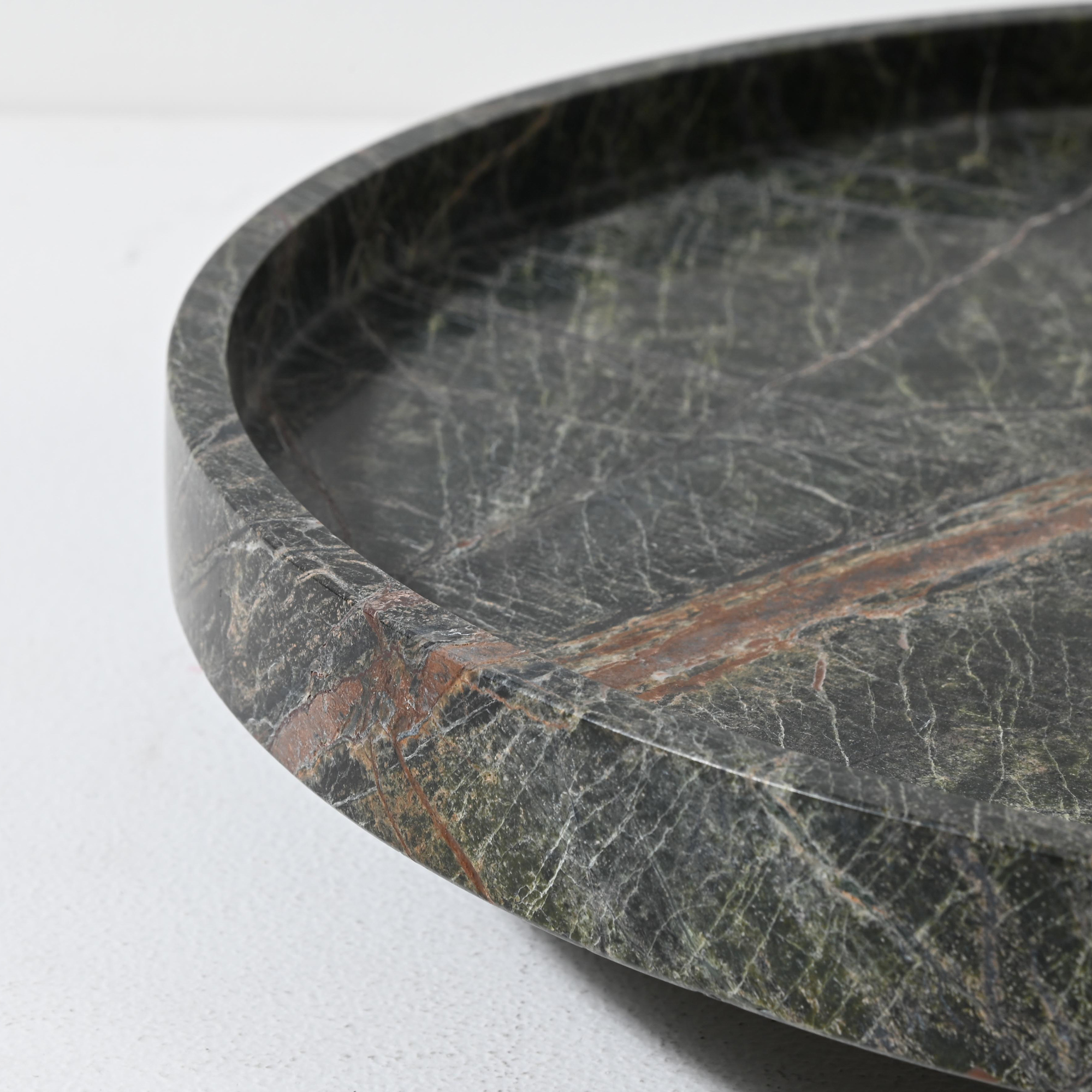 Carved from richly veined green marble, each piece showcases a unique tapestry of deep forest tones, earthy minerals, and soft marbled veining. The natural stone radiates warmth and luxury, while the smooth, recessed surface and gently raised edge make it perfect for curated displays—from candles and objects to fruit or dried florals.