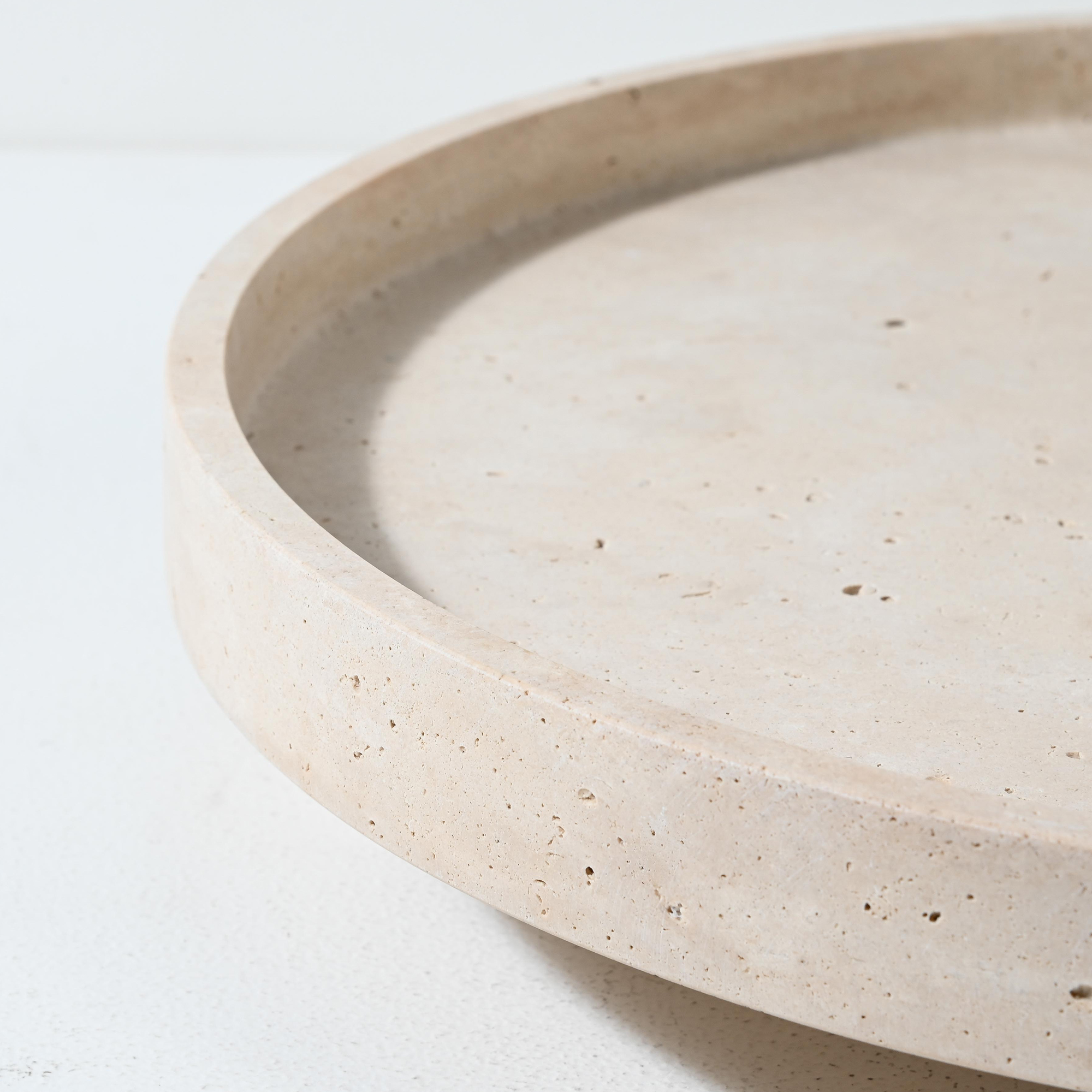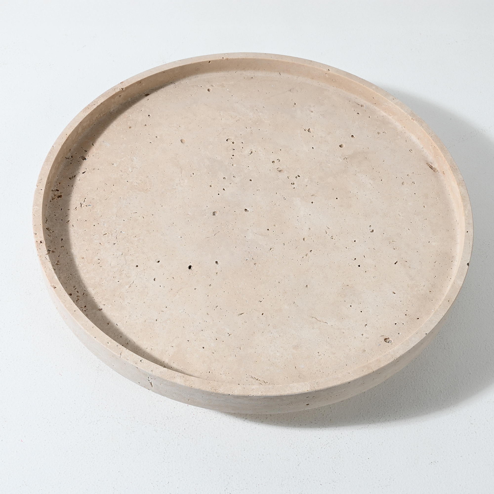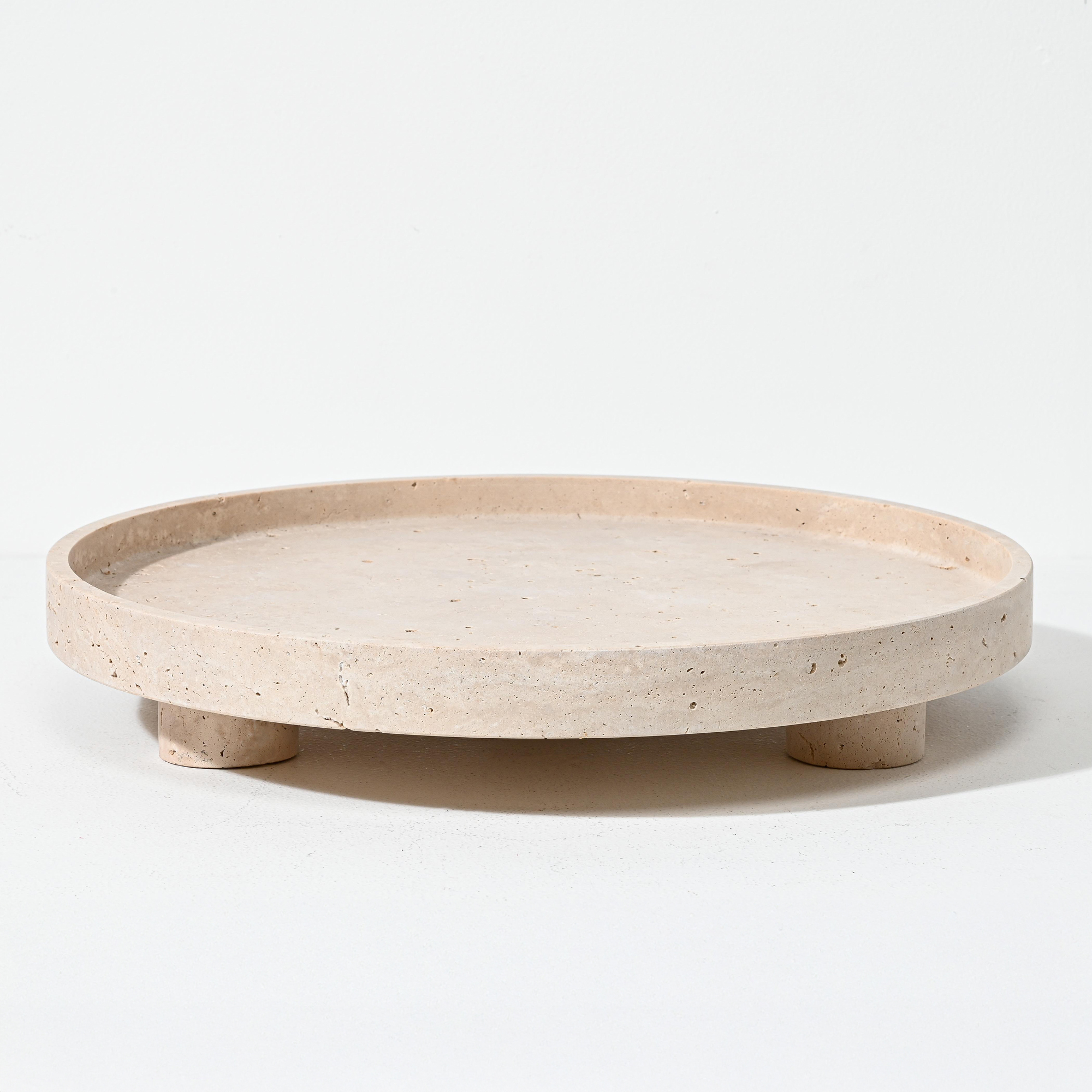 Sculptural and serene, the Namib Raised Plate in travertine sandstone is a striking display piece that merges functional elegance with architectural form. With a generous 45 cm diameter and 7.5 cm height, this round plate sits atop three solid cylindrical legs, creating visual lift and sculptural presence.