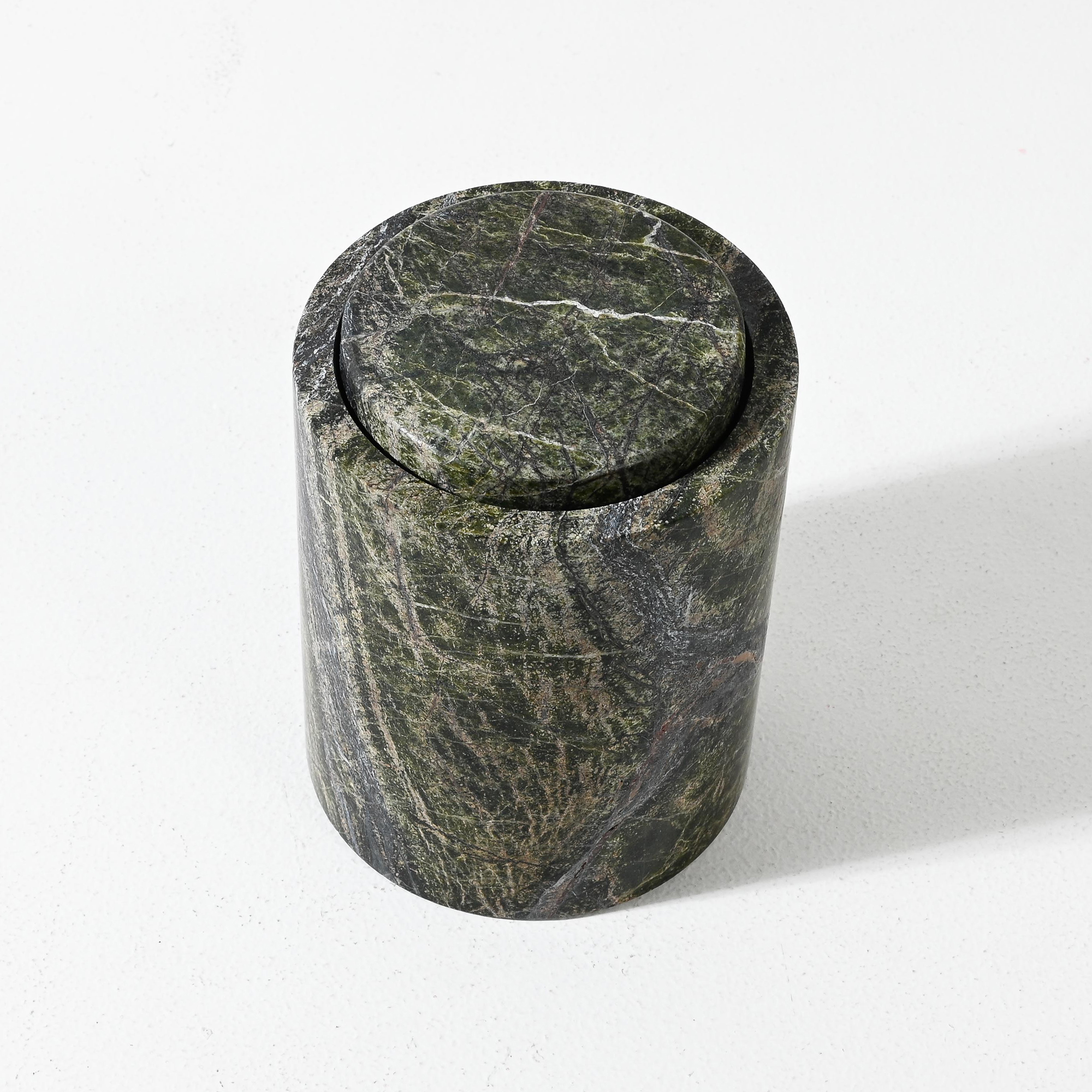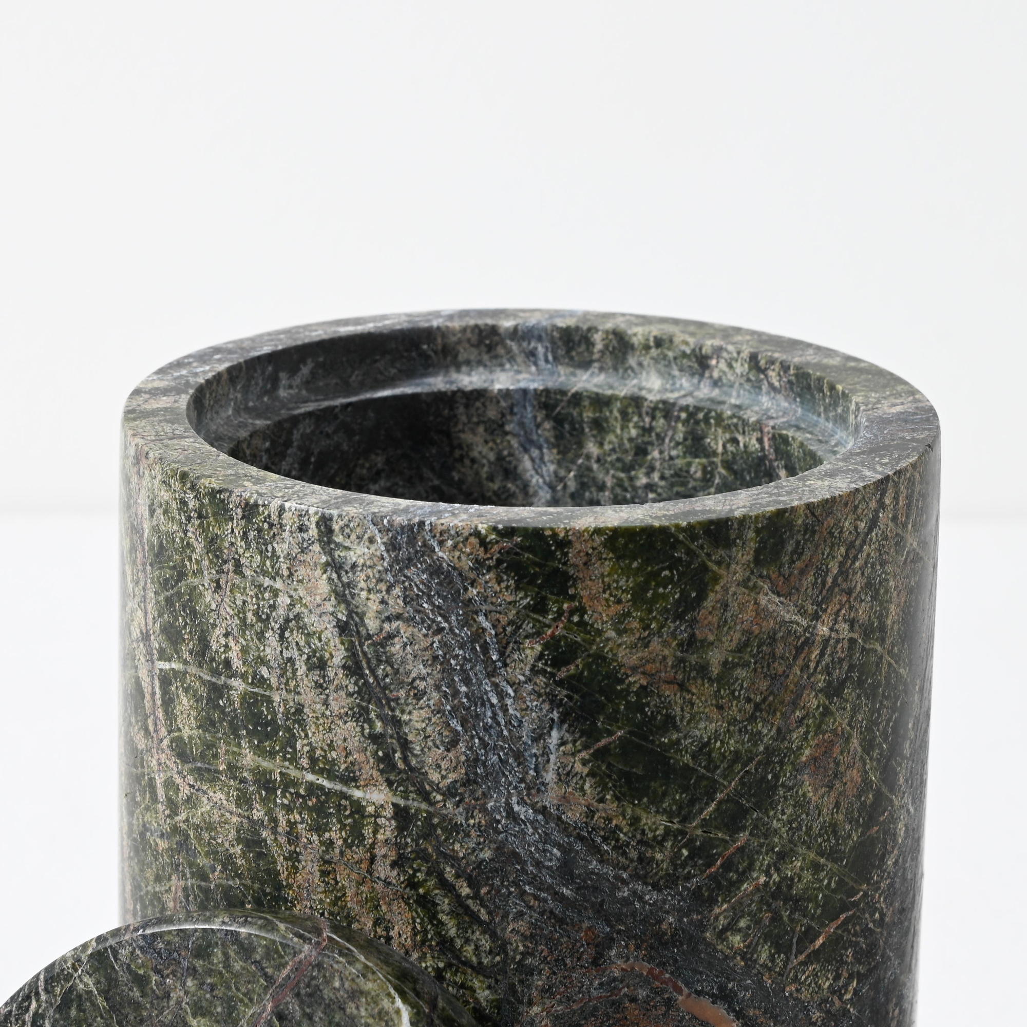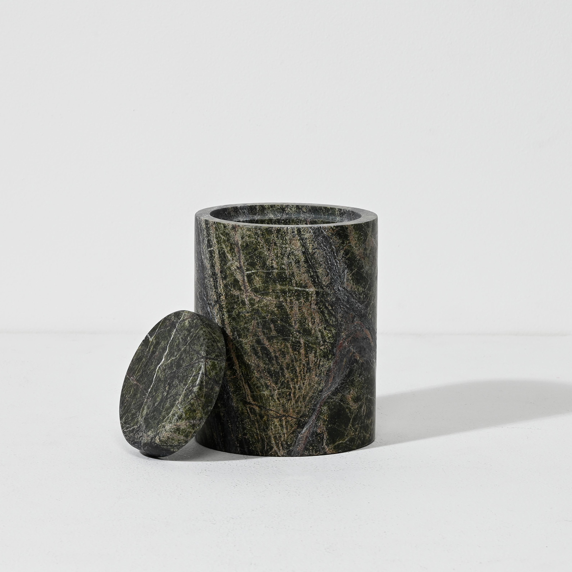 Part of our Namib collection, this vessel is carved from richly veined green marble, offering a luxurious yet grounded accent piece inspired by nature’s raw beauty. Its cylindrical silhouette (15.8 cm high by 12 cm in diameter) is paired with a perfectly fitted lid, allowing it to function as both a decorative object and a discreet storage solution.