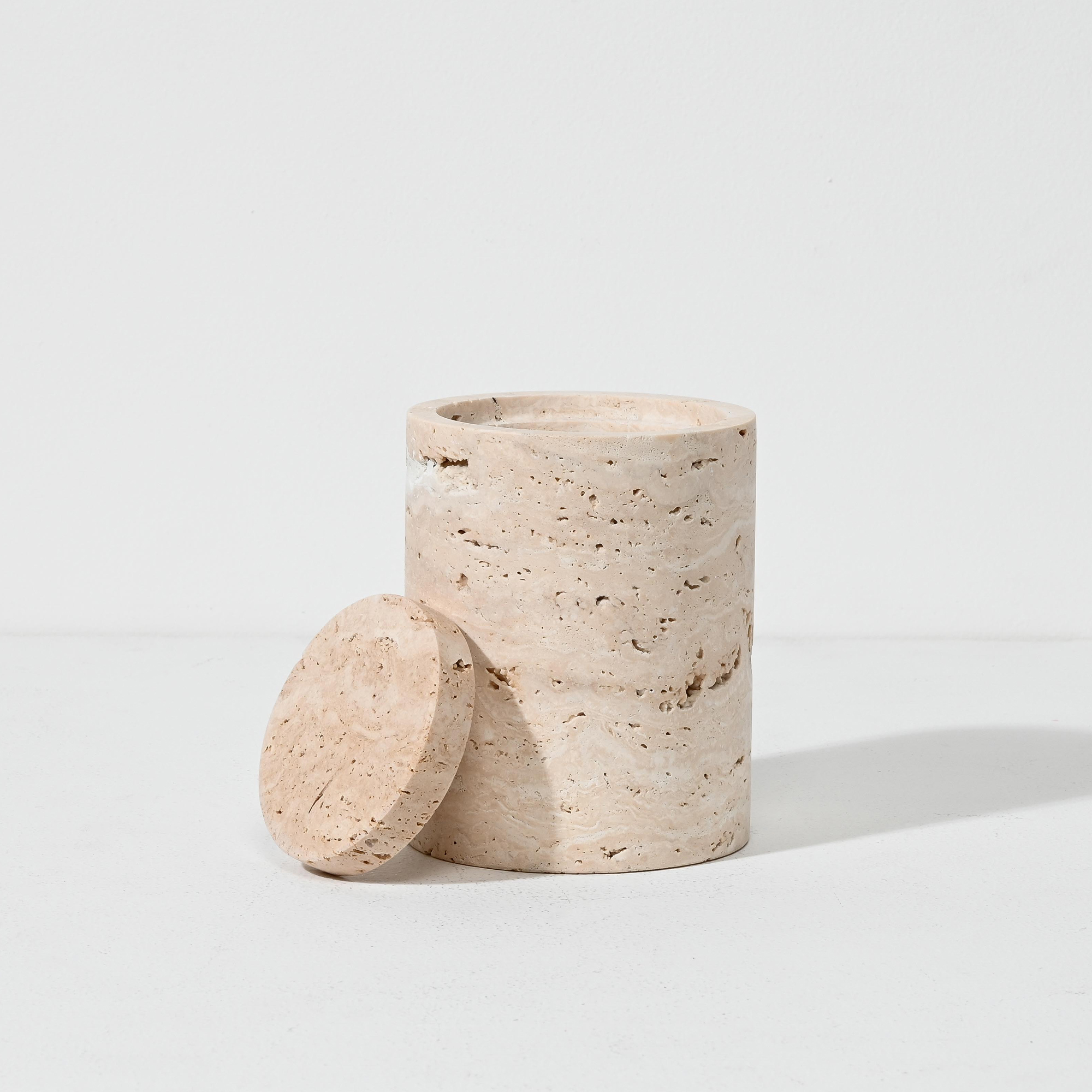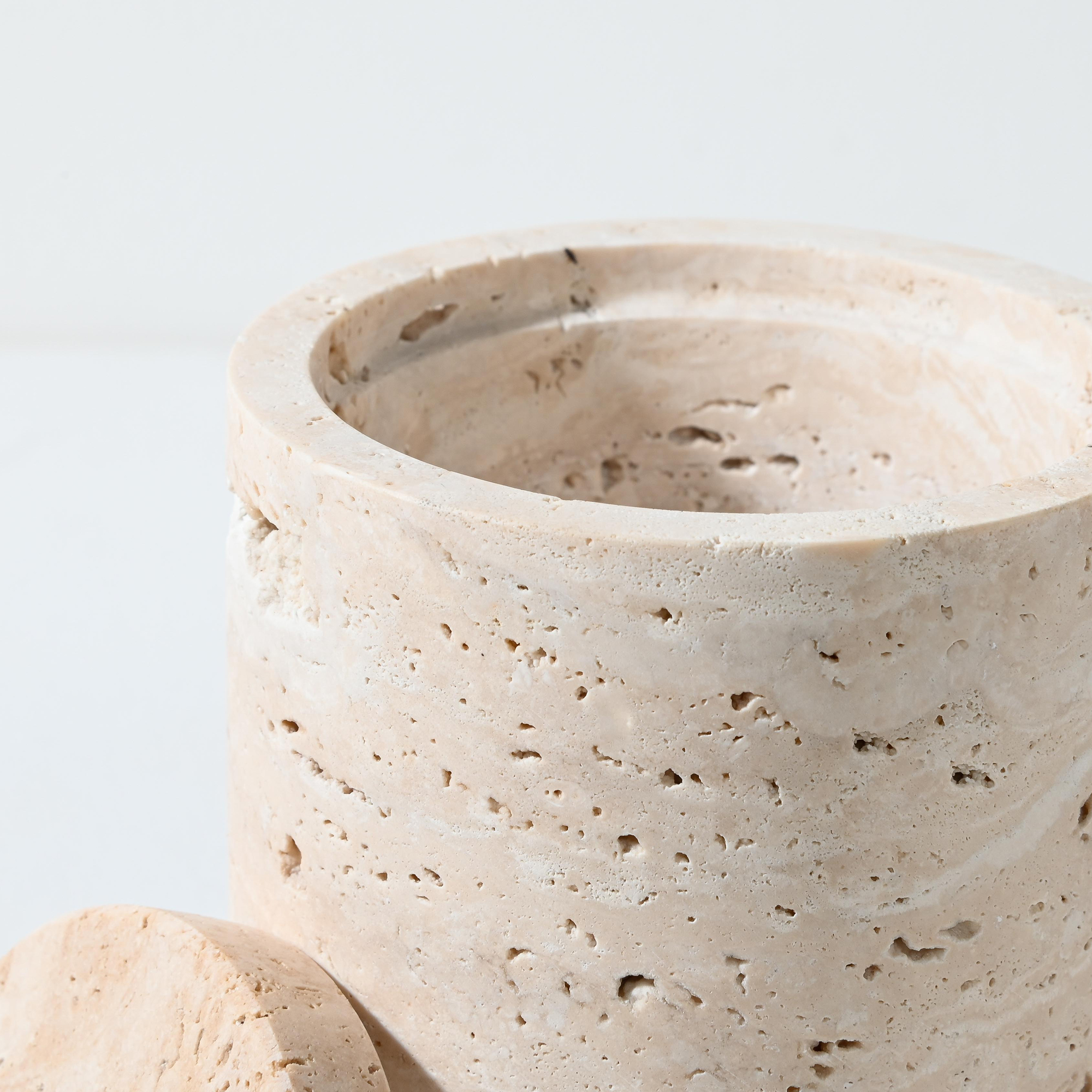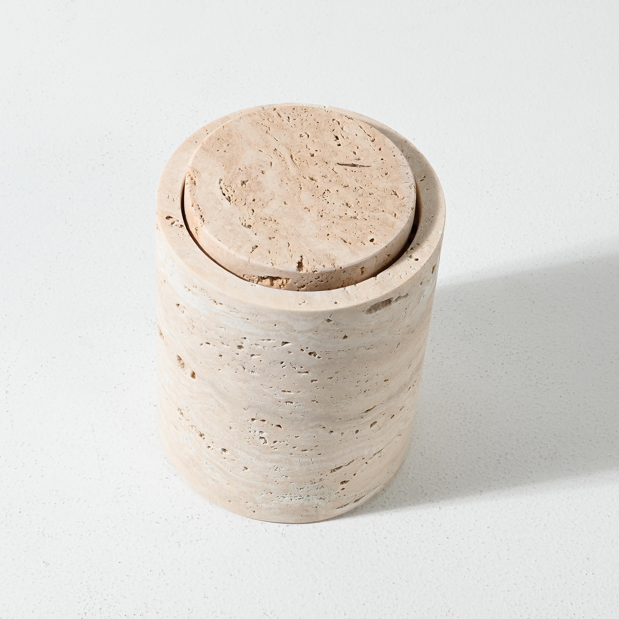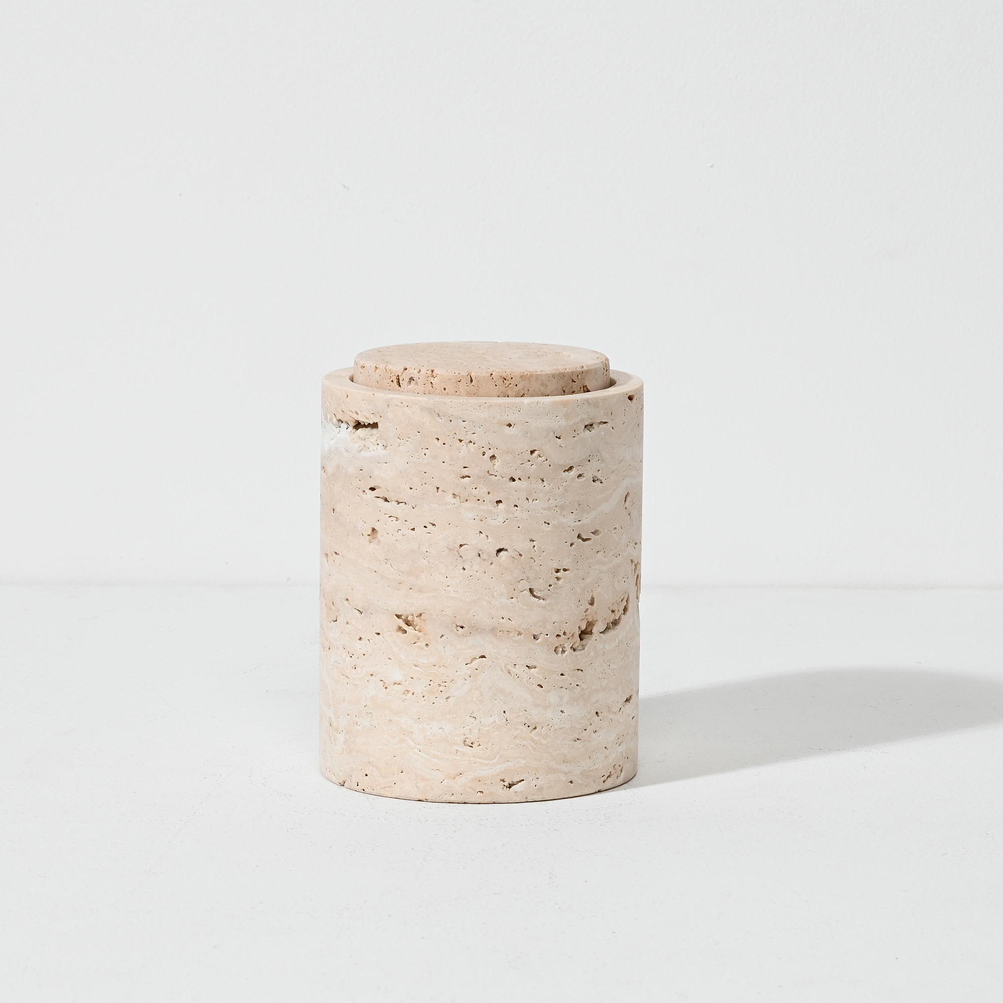 Crafted from natural light travertine sandstone, this vessel is a sculptural storage piece that brings quiet elegance to any interior. Measuring 15.8 cm high by 12 cm in diameter, its cylindrical form showcases the stone’s unique linear veining and subtle tonal variations—each piece offering its own organic pattern and character.