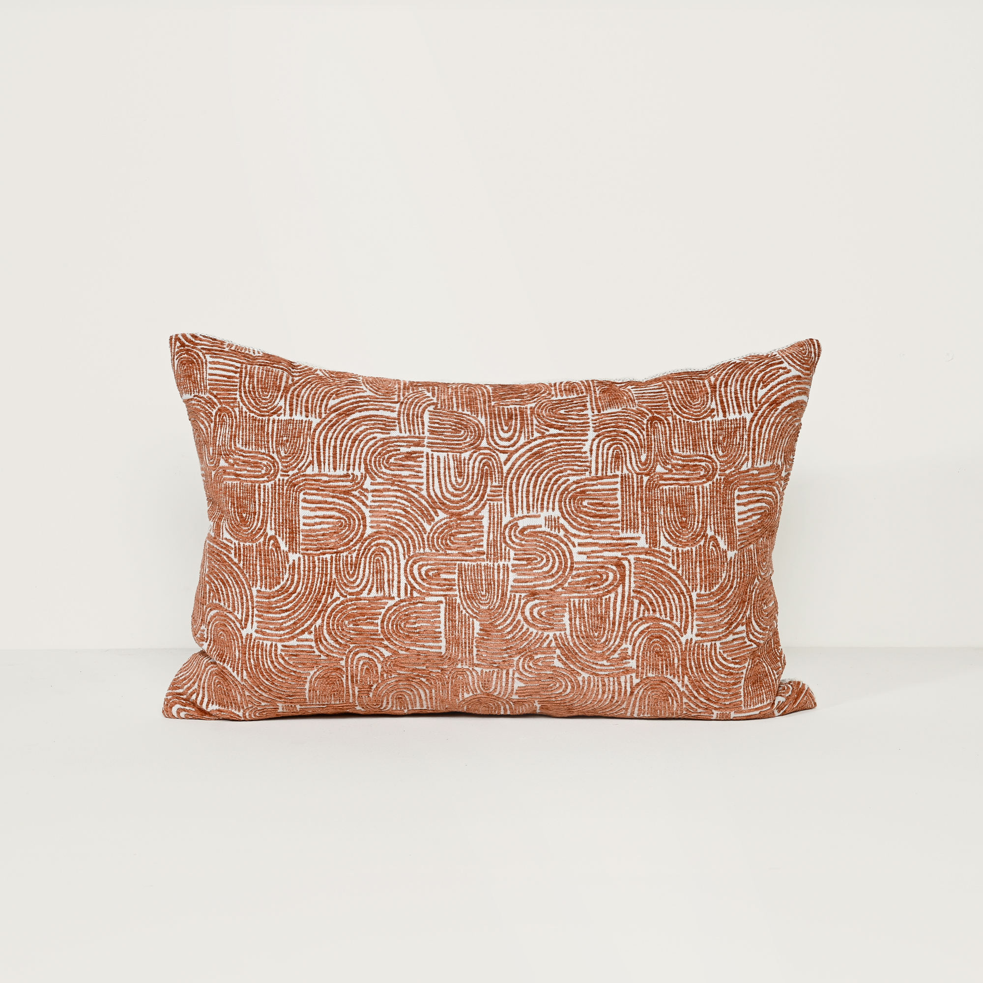 Rusted Swirl has a rusty coloured velour style fabric woven or stitched onto a linen type fabric base. The feel is soft and rich, with the backing not compromise on the quality feel of the cushion. As with all our cushions, it includes our signature generous feather fill and is available in a square and rectangular shape.