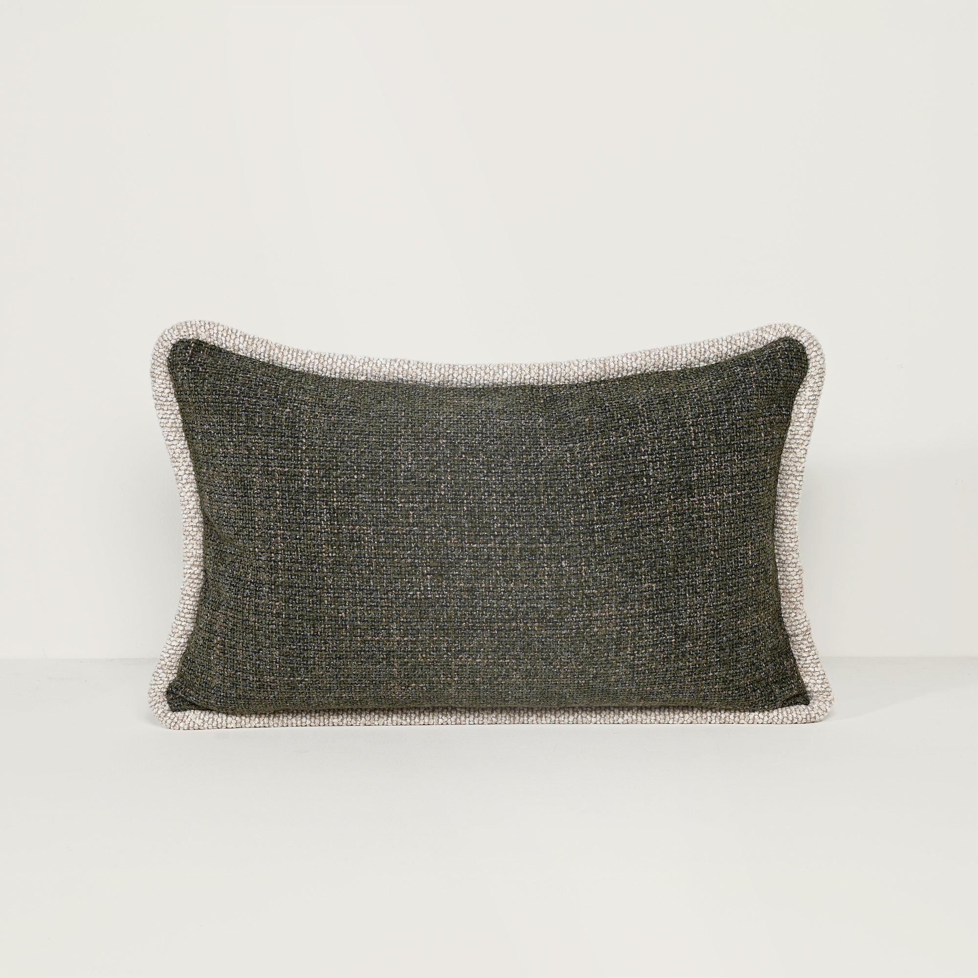 A deep moss colour is elevated by a richly woven textured fabric on the front and back of the cushion, finished in a chunky soft woven piping in a natural colour. As with all our cushions, it includes our signature generous feather fill and is available in a square and rectangular shape.